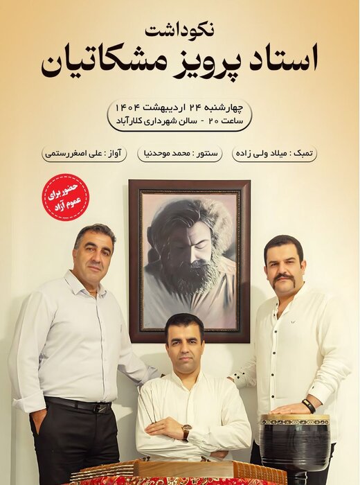 به گزارش ایرنا، مراسم نکوداشت استاد پرویز مشکاتیان با اجرای زنده برگزار می شود. این برنامه فرهنگی و هنری، روز چهارشنبه 24 اردیبهشت 1404 ساعت 20 در سالن شهرداری کلارآباد برگزار خواهد شد و به صورت رایگان و با حضور آزاد عموم علاقمندان اجرا می شود.