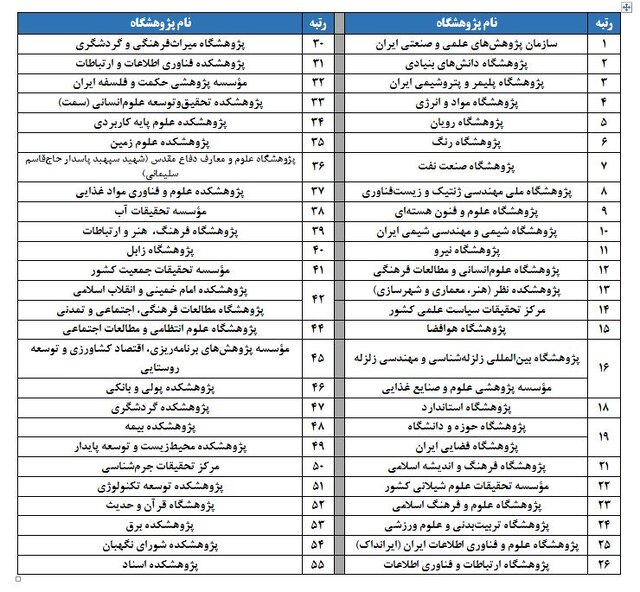 علویان مهر در ادامه افزود: تعداد 58 پژوهشگاه و مؤسسه پژوهشی در رتبه بندی 1402-1401 مؤسسه ISC حضور داشته اند. در ارزیابی این پژوهشگاه ها به صورت در همکرد سازمان پژوهش های علمی و صنعتی ایران، پژوهشگاه صنعت نفت و پژوهشگاه رنگ به ترتیب رتبه های اول تا سوم را به دست آوردند. جدول 3 نتایج رتبه بندی پژوهشگاه ها را به صورت کامل نشان می دهد.