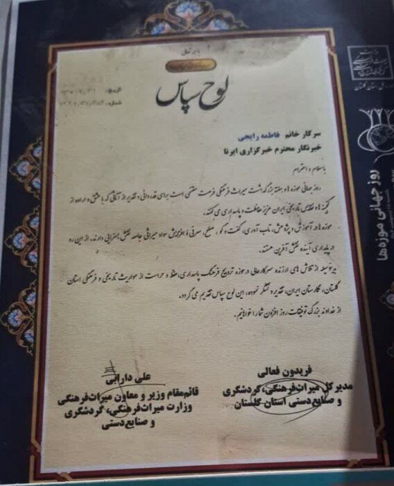 در این مراسم همچنین از فاطمه رایجی خبرنگار ایرنا به واسطه تلاش در ترویج فرهنگ پاسداری، حفظ و حراست از مواریث تاریخی و فرهنگی استان گلستان قدردانی شد.